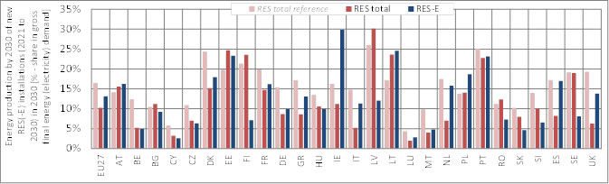 Figure 5 - 2. Country-specific breakdown of RES and RES-E generation from new installations (2021 to 2030) in the year 2030, indicating RES(-E) deployment as share in corresponding demand (i.e. gross final energy demand for RES total, and gross electricity demand for RES-E) (for the assessed policy pathway 5 (ETS only))