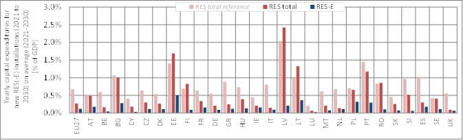 Figure 5 - 4. Country-specific breakdown of yearly average (2021 to 2030) capital expenditures in new RES and RES-E installations (2021 to 2030), expressing investments as share of (country-specific) GDP (for the assessed policy pathway 5 (ETS only)
