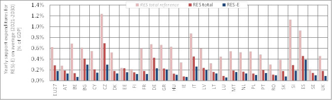 Figure 5 - 5. Country-specific breakdown of yearly average (2021 to 2030) support expenditures for RES total and RES-E, expressing expenditures as share of (country-specific) GDP (for the assessed policy pathway 5 (ETS only))
