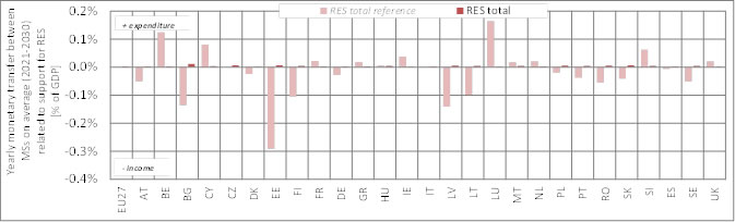 Figure 5 - 6. Yearly average (2021 to 2030) monetary transfers between Member States related to the support for RES, expressing additional expenditures (+) or income (-) as share of (country-specific) GDP (for the assessed policy pathway 5 (ETS only))