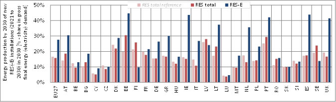 Figure 2b - 2. Country-specific breakdown of RES and RES-E generation from new installations (2021 to 2030) in the year 2030, indicating RES(-E) deployment as share in corresponding demand (i.e. gross final energy demand for RES total, and gross electricity demand for RES-E) (for the assessed policy pathway 2b (FIP medium))