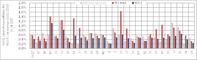 Figure 2b - 5. Country-specific breakdown of yearly average (2021 to 2030) support expenditures for RES total and RES-E, expressing expenditures as share of (country-specific) GDP (for the assessed policy pathway 2b (FIP medium))