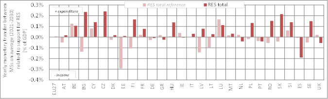 Figure 2b - 6. Yearly average (2021 to 2030) monetary transfers between Member States related to the support for RES, expressing additional expenditures (+) or income (-) as share of (country-specific) GDP (for the assessed policy pathway 2b (FIP medium))