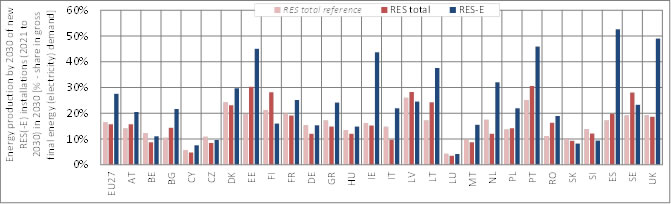 Figure 1b - 2. Country-specific breakdown of RES and RES-E generation from new installations (2021 to 2030) in the year 2030, indicating RES(-E) deployment as share in corresponding demand (i.e. gross final energy demand for RES total, and gross electricity demand for RES-E) (for the assessed policy pathway 1b (FIT medium))