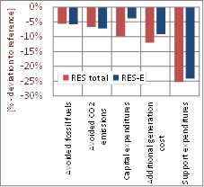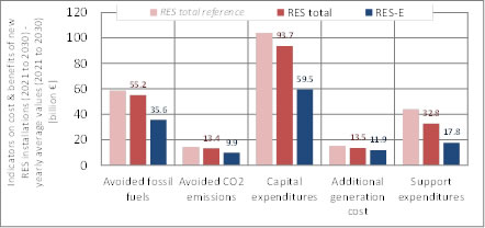 Figure 1b - 3. Indicators on cost/expenditures and benefits of new RES(-E) installations (2021 to 2030), expressing yearly average (2021 to 2030) monetary values at EU-27 level in absolute terms (left) and the change compared to reference (for the assessed policy pathway 1b (FIT medium))