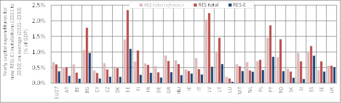 Figure 1b - 4. Country-specific breakdown of yearly average (2021 to 2030) capital expenditures in new RES and RES-E installations (2021 to 2030), expressing investments as share of (country-specific) GDP (for the assessed policy pathway 1b (FIT medium)