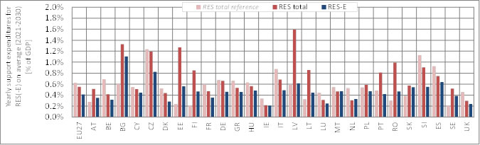 Figure 1b - 5. Country-specific breakdown of yearly average (2021 to 2030) support expenditures for RES total and RES-E, expressing expenditures as share of (country-specific) GDP (for the assessed policy pathway 1b (FIT medium))