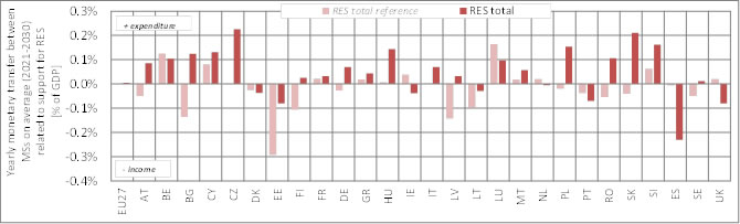 Figure 1b - 6. Yearly average (2021 to 2030) monetary transfers between Member States related to the support for RES, expressing additional expenditures (+) or income (-) as share of (country-specific) GDP (for the assessed policy pathway 1b (FIT medium))