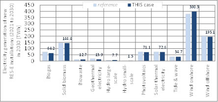 Figure 1c - 1. Technology-specific breakdown of RES-E generation from new installations (2021 to 2030) at EU-27 level in the year 2030, indicating deployment in absolute terms (left) and the change compared to reference (right) (for the assessed policy pathway 1c (FIT soft))