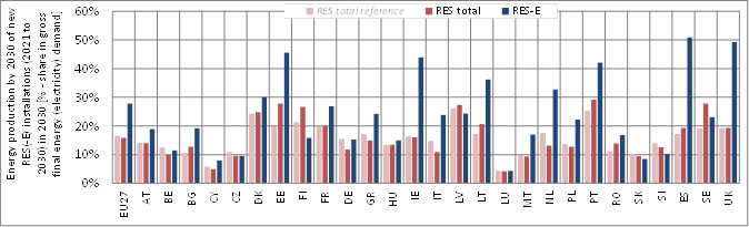 Figure 1c - 2. Country-specific breakdown of RES and RES-E generation from new installations (2021 to 2030) in the year 2030, indicating RES(-E) deployment as share in corresponding demand (i.e. gross final energy demand for RES total, and gross electricity demand for RES-E) (for the assessed policy pathway 1c (FIT soft))