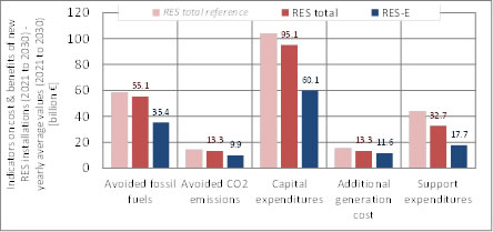 Figure 1c - 3. Indicators on cost/expenditures and benefits of new RES(-E) installations (2021 to 2030), expressing yearly average (2021 to 2030) monetary values at EU-27 level in absolute terms (left) and the change compared to reference (for the assessed policy pathway 1c (FIT soft))