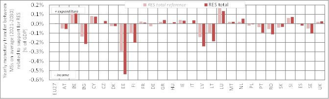 Figure 1c - 6. Yearly average (2021 to 2030) monetary transfers between Member States related to the support for RES, expressing additional expenditures (+) or income (-) as share of (country-specific) GDP (for the assessed policy pathway 1c (FIT soft))