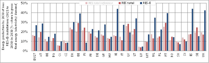 Figure 4b - 2. Country-specific breakdown of RES and RES-E generation from new installations (2021 to 2030) in the year 2030, indicating RES(-E) deployment as share in corresponding demand (i.e. gross final energy demand for RES total, and gross electricity demand for RES-E) (for the assessed policy pathway 4b (QUO banding medium))