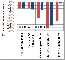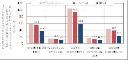 Figure 4b - 3. Indicators on cost/expenditures and benefits of new RES(-E) installations (2021 to 2030), expressing yearly average (2021 to 2030) monetary values at EU-27 level in absolute terms (left) and the change compared to reference (for the assessed policy pathway 4b (QUO banding medium))