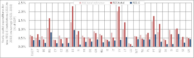 Figure 4b - 4. Country-specific breakdown of yearly average (2021 to 2030) capital expenditures in new RES and RES-E installations (2021 to 2030), expressing investments as share of (country-specific) GDP (for the assessed policy pathway 4b (QUO banding medium)