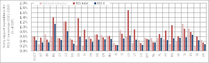Figure 4b - 5. Country-specific breakdown of yearly average (2021 to 2030) support expenditures for RES total and RES-E, expressing expenditures as share of (country-specific) GDP (for the assessed policy pathway 4b (QUO banding medium))