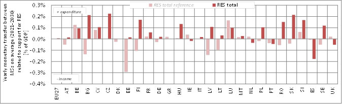 Figure 4b - 6. Yearly average (2021 to 2030) monetary transfers between Member States related to the support for RES, expressing additional expenditures (+) or income (-) as share of (country-specific) GDP (for the assessed policy pathway 4b (QUO banding medium))