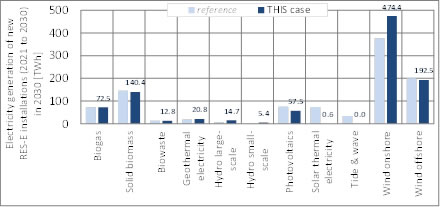 Figure 3c - 1. Technology-specific breakdown of RES-E generation from new installations (2021 to 2030) at EU-27 level in the year 2030, indicating deployment in absolute terms (left) and the change compared to reference (right) (for the assessed policy pathway 3c (QUO soft))