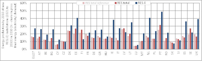 Figure 3c - 2. Country-specific breakdown of RES and RES-E generation from new installations (2021 to 2030) in the year 2030, indicating RES(-E) deployment as share in corresponding demand (i.e. gross final energy demand for RES total, and gross electricity demand for RES-E) (for the assessed policy pathway 3c (QUO soft))