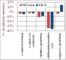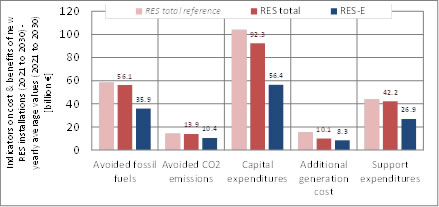 Figure 3c - 3. Indicators on cost/expenditures and benefits of new RES(-E) installations (2021 to 2030), expressing yearly average (2021 to 2030) monetary values at EU-27 level in absolute terms (left) and the change compared to reference (for the assessed policy pathway 3c (QUO soft))