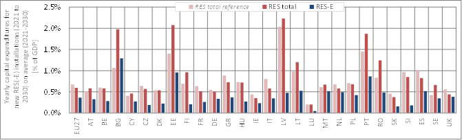 Figure 3c - 4. Country-specific breakdown of yearly average (2021 to 2030) capital expenditures in new RES and RES-E installations (2021 to 2030), expressing investments as share of (country-specific) GDP (for the assessed policy pathway 3c (QUO soft)