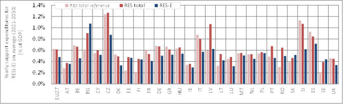Figure 3c - 5. Country-specific breakdown of yearly average (2021 to 2030) support expenditures for RES total and RES-E, expressing expenditures as share of (country-specific) GDP (for the assessed policy pathway 3c (QUO soft))