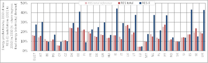 Figure 7d - 2. Country-specific breakdown of RES and RES-E generation from new installations (2021 to 2030) in the year 2030, indicating RES(-E) deployment as share in corresponding demand (i.e. gross final energy demand for RES total, and gross electricity demand for RES-E) (for the assessed policy pathway 7d (REF min criteria))