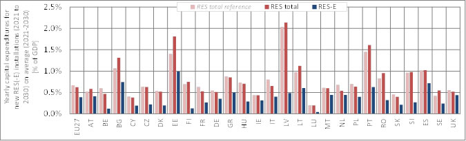 Figure 7d - 4. Country-specific breakdown of yearly average (2021 to 2030) capital expenditures in new RES and RES-E installations (2021 to 2030), expressing investments as share of (country-specific) GDP (for the assessed policy pathway 7d (REF min criteria)