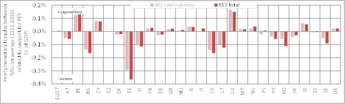Figure 7d - 6. Yearly average (2021 to 2030) monetary transfers between Member States related to the support for RES, expressing additional expenditures (+) or income (-) as share of (country-specific) GDP (for the assessed policy pathway 7d (REF min criteria))